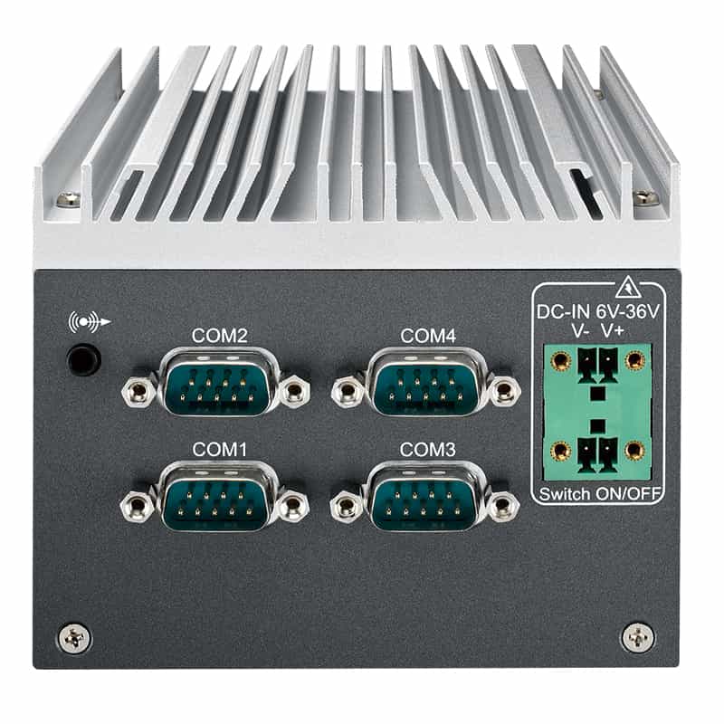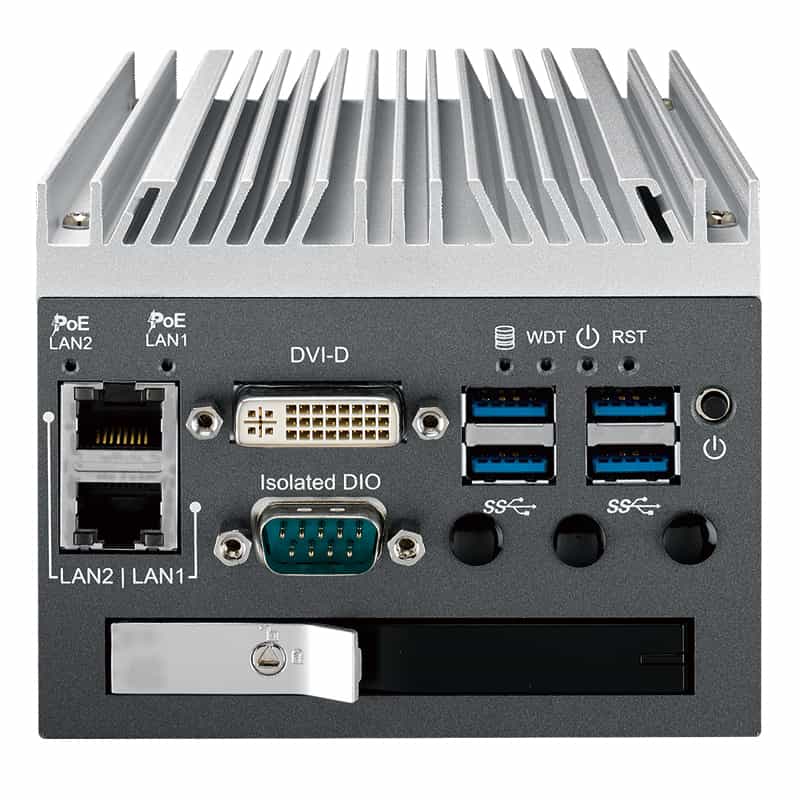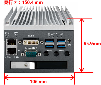 | インターフェイス | フロント USB3.0 ×4、PoE+ Gigabit Ethernet ×2 DVI-D ×1、2.5インチSATA2 ×1 Isolated DIOポート ×1、電源スイッチ |