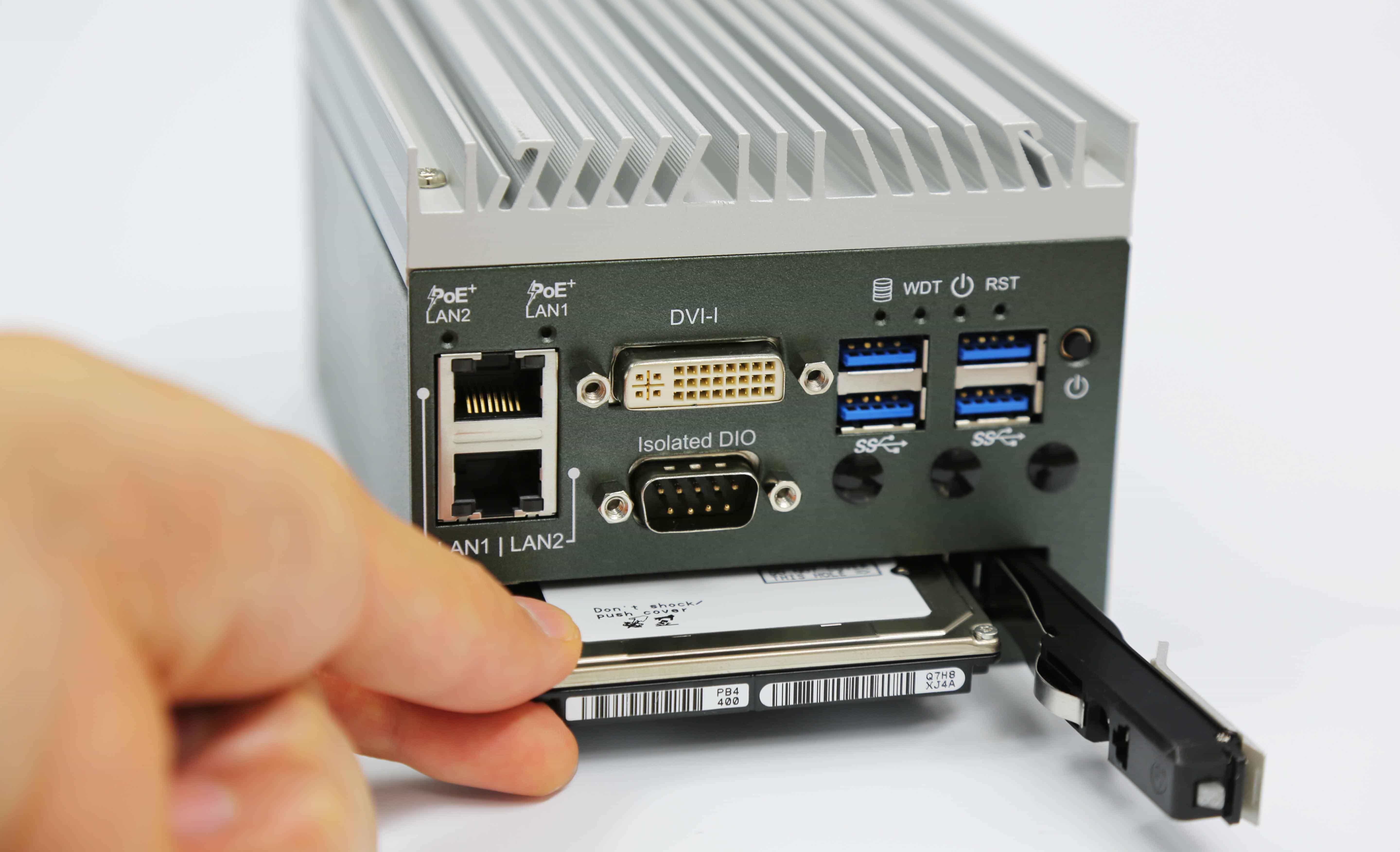 倉庫、ガレージ、工場など温度変化の激しい場所でデータを収集したいお客様におすすめのPCです。監視カメラで使われることの多い電力供給のできるギガビットイーサネットPOE+を2ポート標準で内蔵。小規模のデータ収集ニーズにお応えすることができます。なお、ドライバー不要でワンタッチでストレージを交換可能。メンテナンスも簡単です。