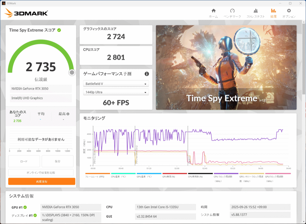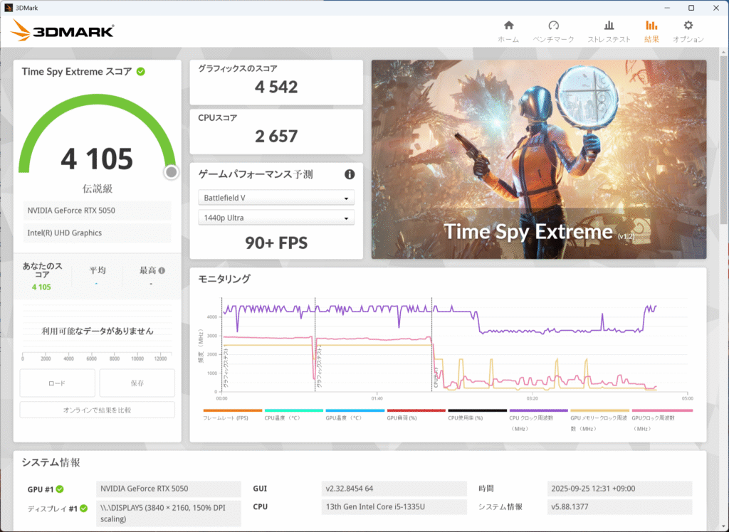 3DMark Time Spy Extremeのスコアは4000台になり、RTX3050から150%アップです。RTX3050もRTX5050もグラフィックボードとしてはエントリークラスのボードですが、世代の違いによるグラフィック性能の進化はすごいですね。