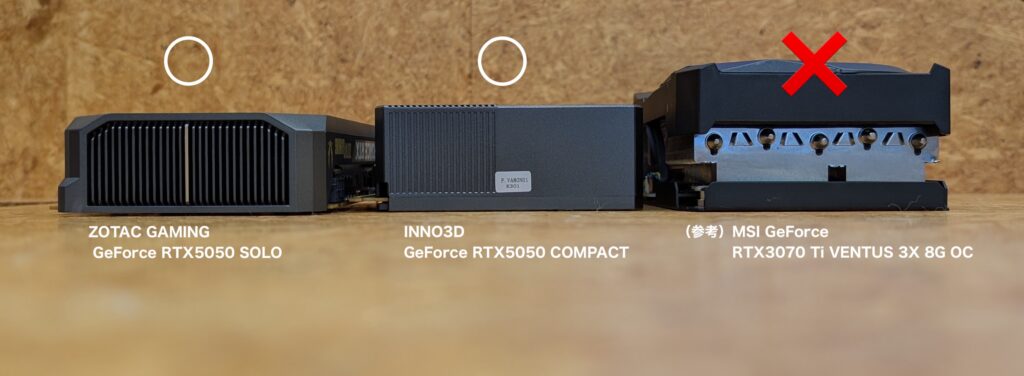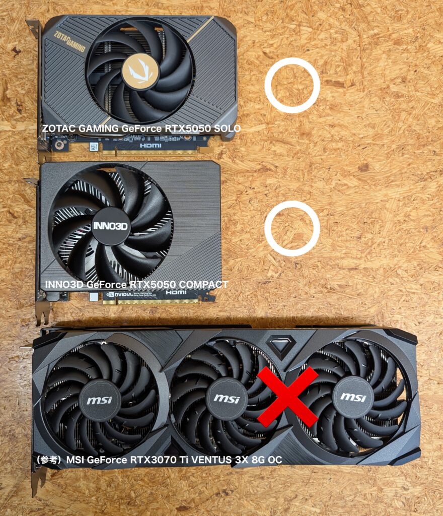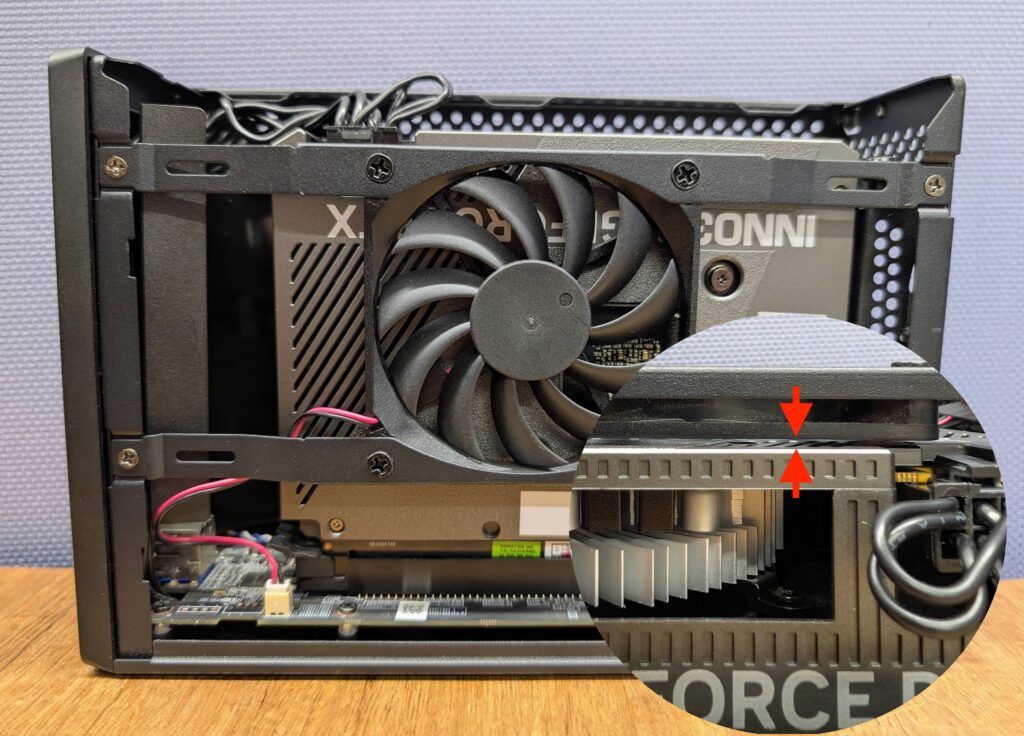 今回、テストに使用したZOTAC GAMING GeForce RTX 5050 SOLO(以下RTX5050 SOLO)のサイズは164.5mm x 111.2mm x 36.4mmと問題ありませんが、INNO3D® GeForce RTX™ 5050 COMPACT」(以下RTX5050 COMPACT)は 148mm×118mm×41mmと厚さがオーバーしています。前回テストしたグラフィックボードSPARKLE RTX3050(以下RTX3050)を実測すると175mm x 110mm x 42mm! ならばRTX5050 COMPACTもいけるのではないかと試しに装着してみましたら、写真のように冷却ファンとの間隔がギリギリで装着できました。(今回は組込み可能条件よりも幅が若干上回ったサイズのボードを組み込むことができましたが、グラフィックボードに搭載されたヒートシンクおよびファンのサイズおよび形状によっては、条件を満たすものでも取り付けできない場合があります。十分にご確認していただいた上でボードをお選びください。)