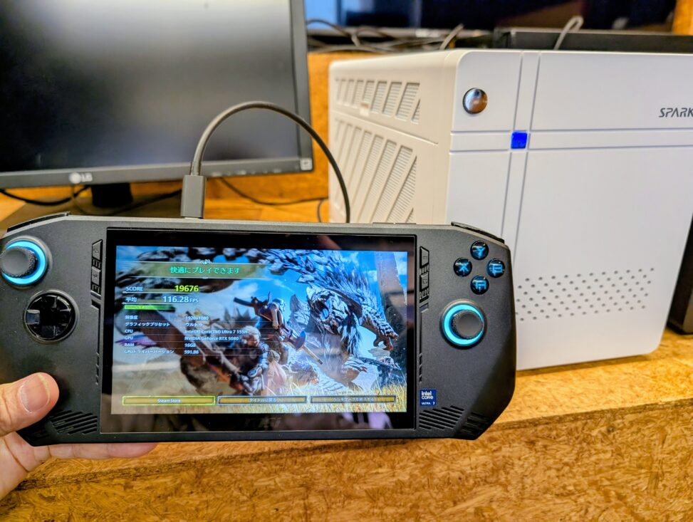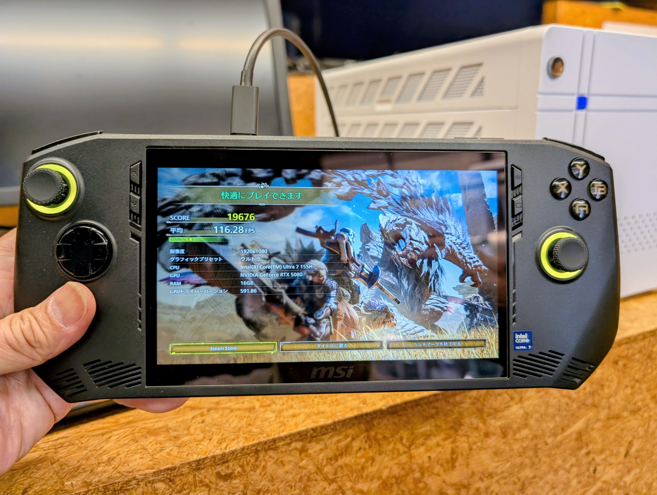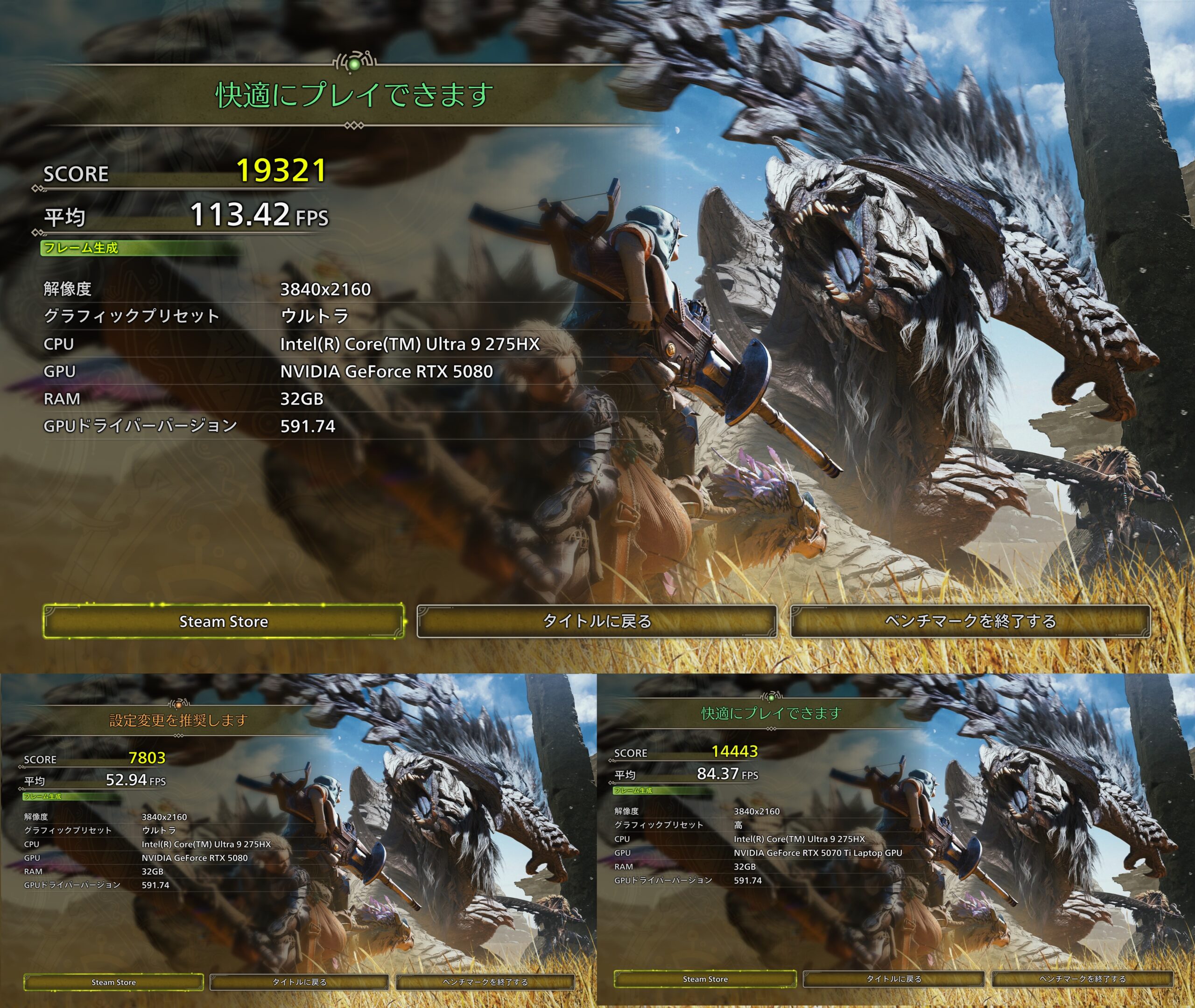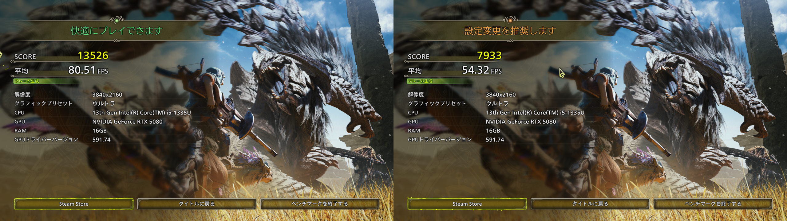 一方、同じグラフィックボードRTX5080を組み込んだG750の測定結果は「設定変更を推奨します」とDGPUよりも低いスコアになってしまいました。モンハンの場合、モンスターの挙動や環境変化が激しく、PCのCPUとGPUの間でのデータの転送量が多いため、Thunderbolt5(理論転送速度80Gbps)とThunderbolt3(理論転送速度40Gbps)の転送速度の差や本製品とG750のコントローラー世代の性能の差が出たようです。