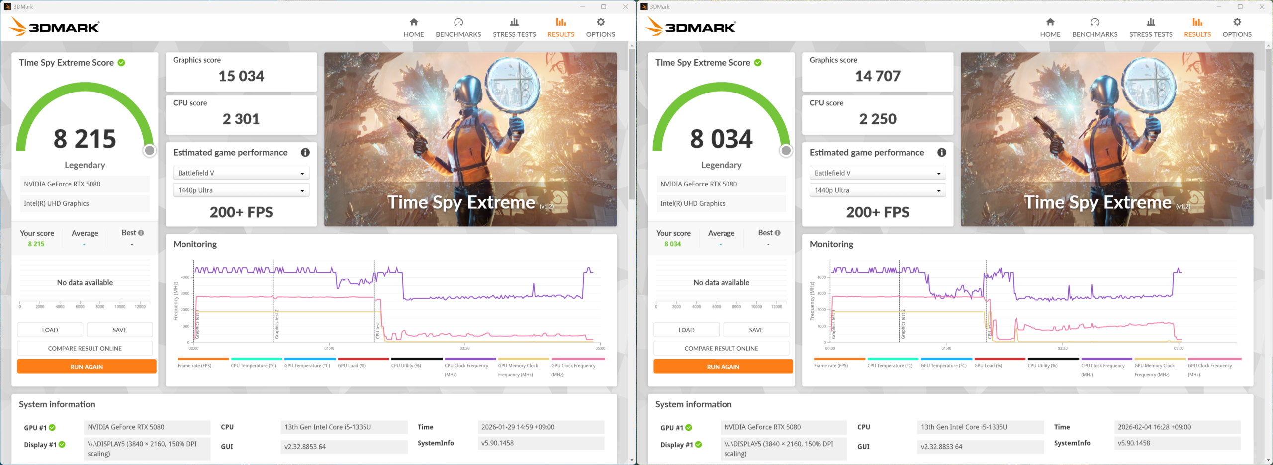 こちらはスコアで約1.68倍、グラフィックスのスコアではおよそ1.82倍と、GPU(RTX5080、RTX5070 Ti LAPTOP版)の性能差が際立つ結果となりました!